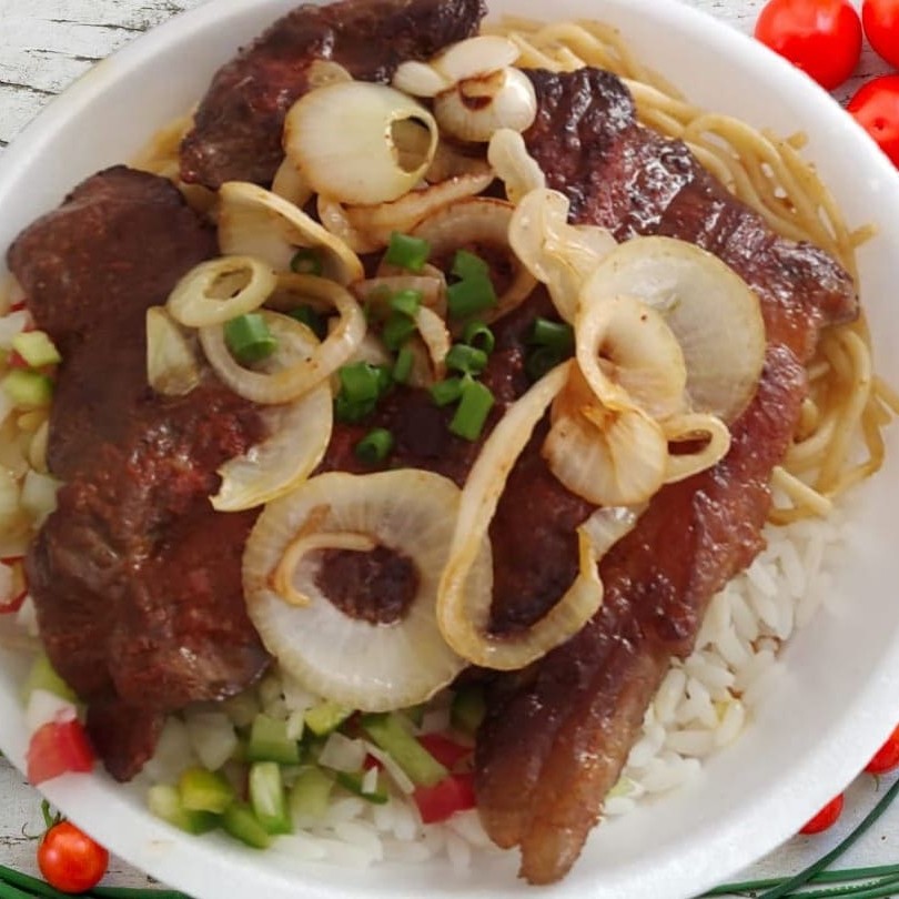 Uma deliciosa charque acebolado na medida vai feijão, arroz, macarrão,farofa,vinagrete.