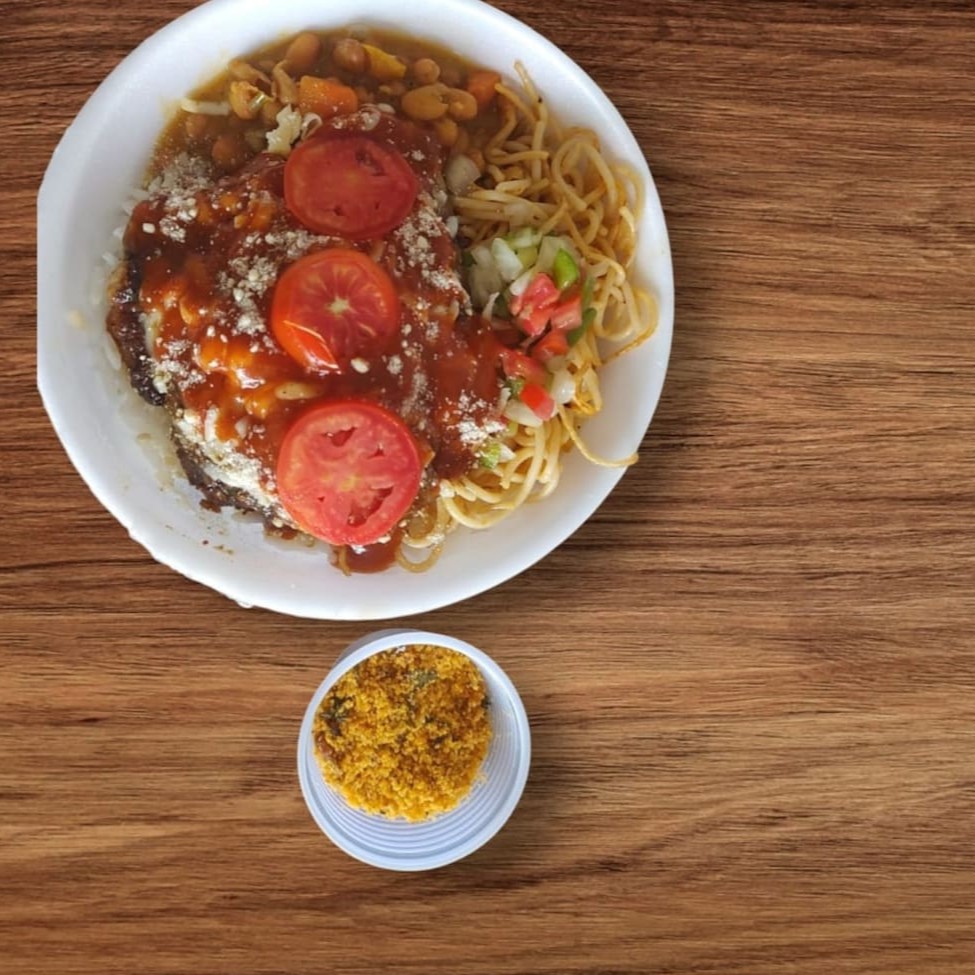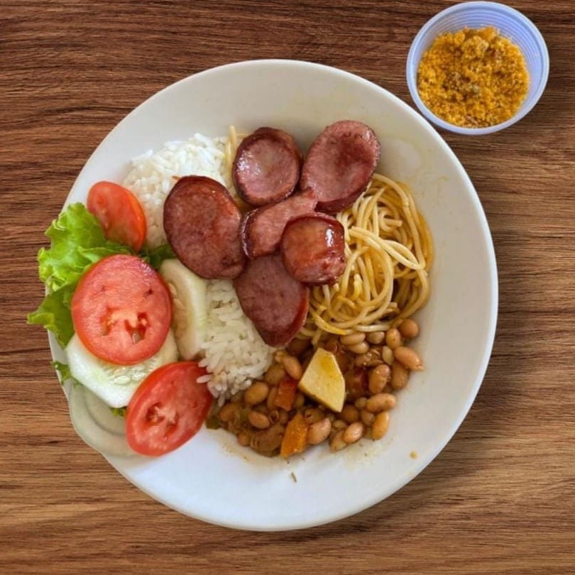 Vai feijão mulatinho, arroz, macarrão, farofa, vinagrete.