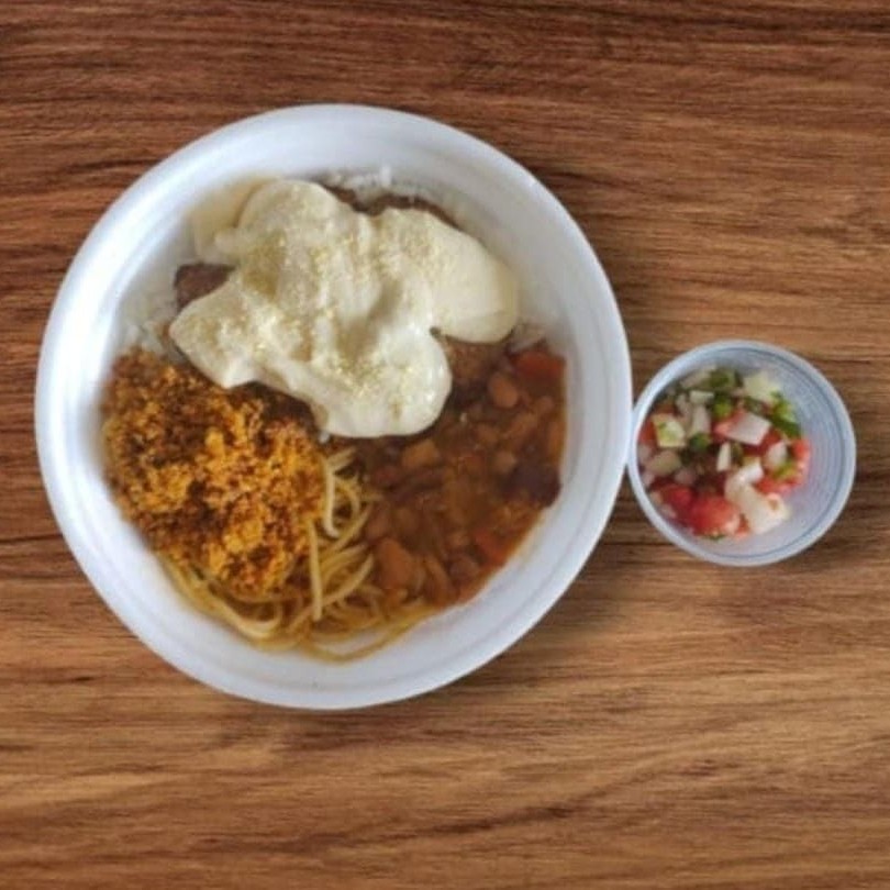 Carne de Sol Acebolado vai Feijão mulado, arroz, Macarrão, Farofa e Vinagrete. ( Marmita 400g )