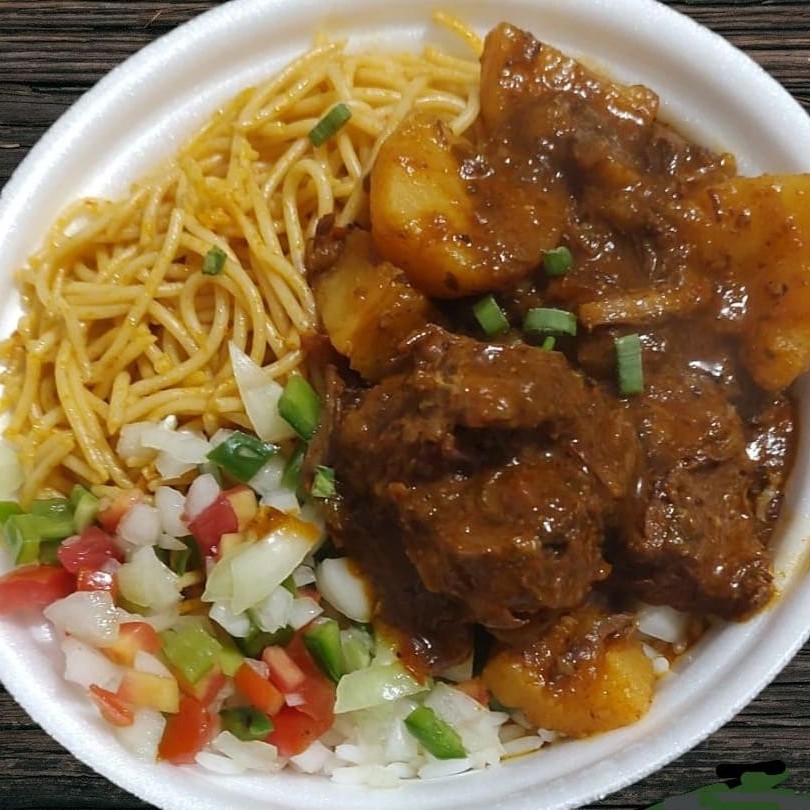 Um delicioso guisado de carne com batatas temperado com alho, tempero baiano, tomate, celola, pimentão vai feijão mulado, arroz, macarrão, vinagrete, farofa. ( marmita 400g )