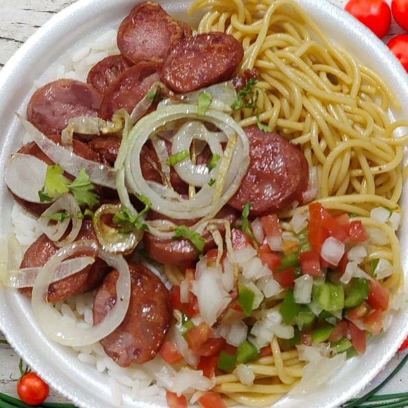 Uma deliciosa marmita de calabresa 70g acebolado para que ama comer bem e paga pouco. Vai feijão,arroz, macarrão, vinagrete, farofa.