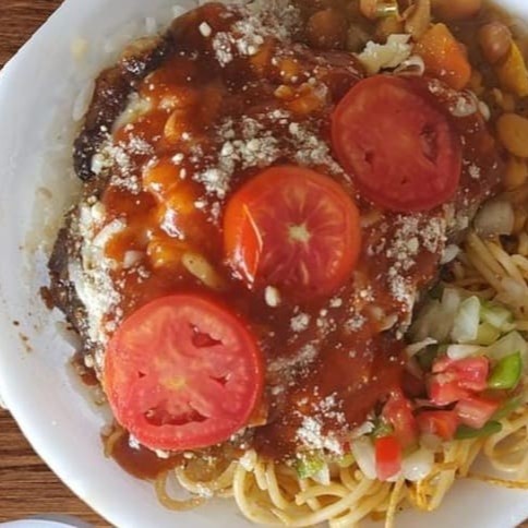 Um delicioso bife á pizzaolo no capricho . Vai feijão mulado, arroz, macarrão, vinagrete, farofa. ( Marmita 400g )