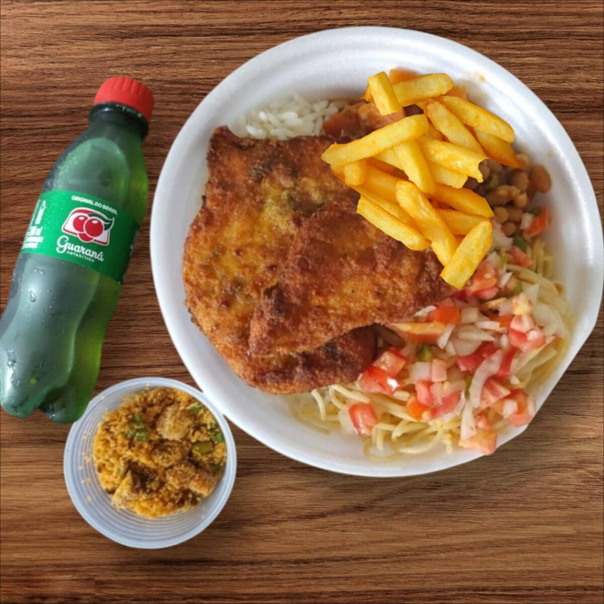 Um delicioso Filezinho empanado +Refri de 200ml Vai feijão, arroz, ma.carrão, farofa, vinagrete