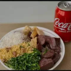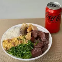 Marmita feijoada magra individual (arroz branco, costelinha, linguiça calabresa, paio, couve refogado, farofa e torresmo) + coca cola lata normal 350ml. Marmita indicada para 01 pessoa.