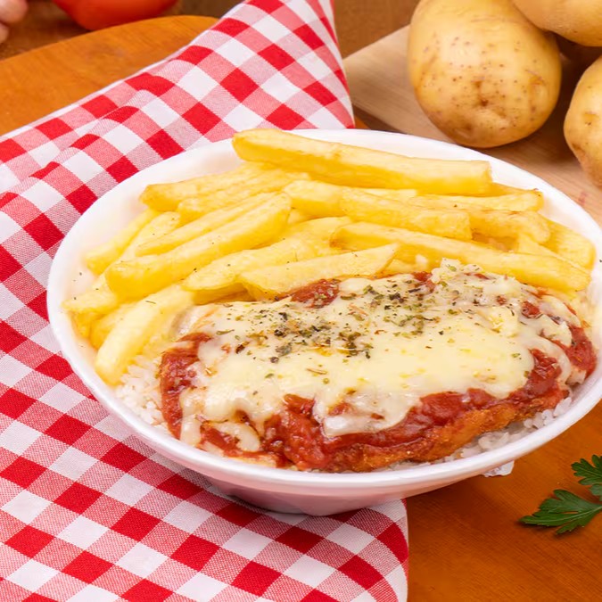 Parmegiana de frango empanado crocante, coberta com molho de tomate caseiro e queijo derretido, acompanhada de macarrão ao molho e uma batata frita douradinha. Uma combinação irresistível, perfeita pra matar a fome com muito sabor!