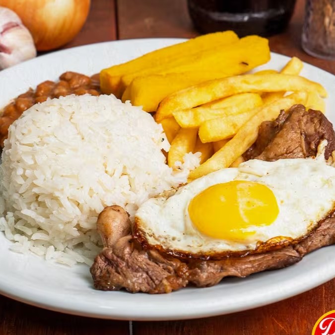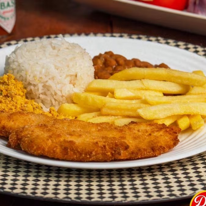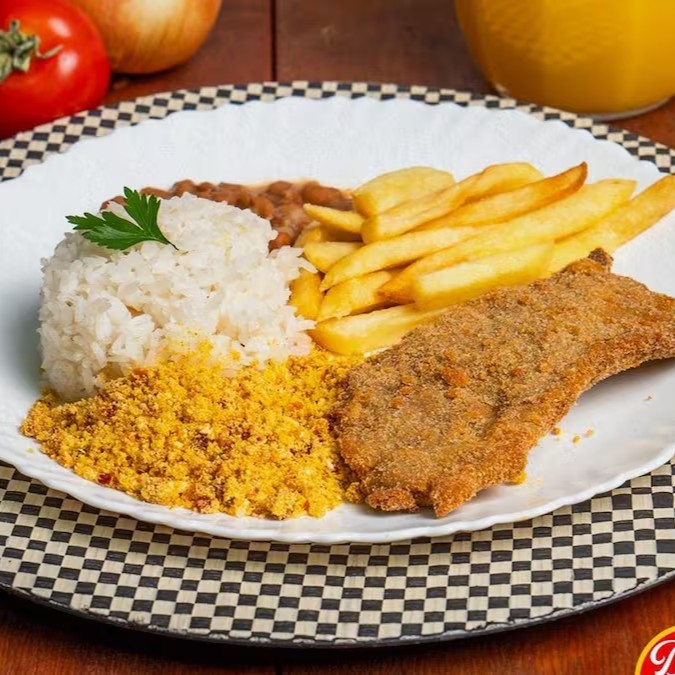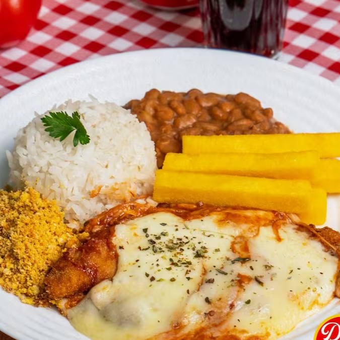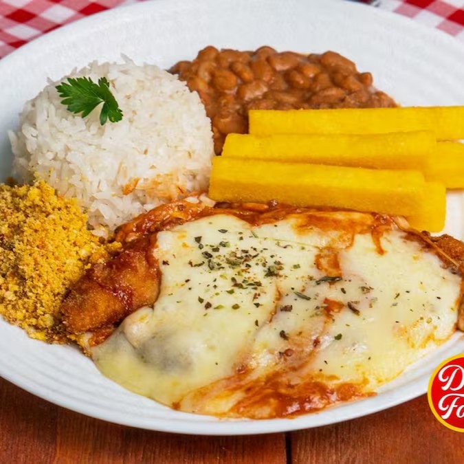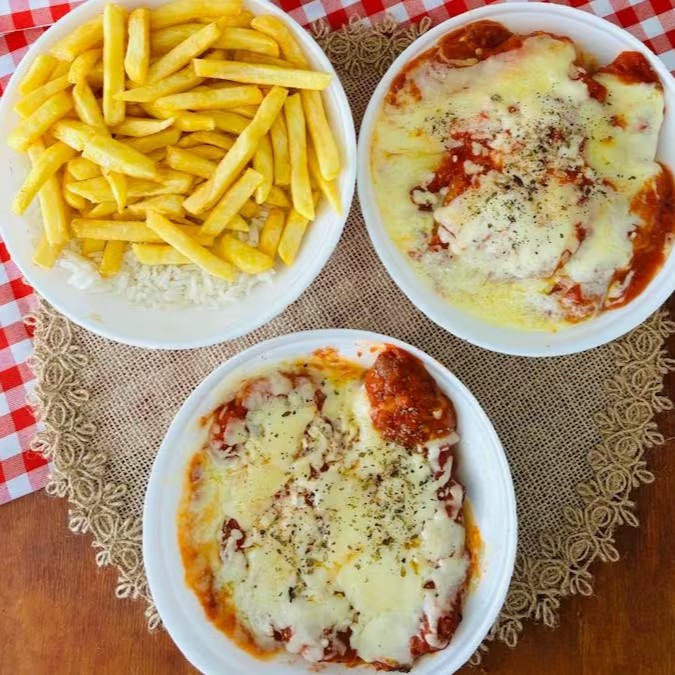 Clássico dos clássicos: Parme crocante com queijo derretido, arroz soltinho, Feijao Macassar temperado e batatas sequinhas. Combinação simples e irresistível.