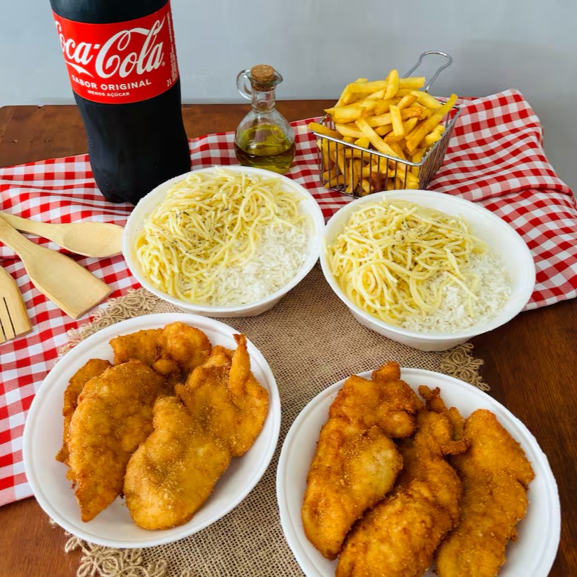 Esse combo é perfeito para voce dividir , 2 marmitex médias milanesa de frango , com acompanhamento de batata frita e macarrão alho e óleo ,e a bebida perfeita : coca cola 2 litros !