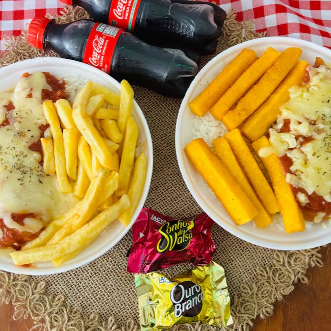 O combo mais queridinho de todos acompanha : 2 marmitas de parmegiana de frango com o acompanhamento de batata frita + 2 Coca-Cola mini de 200ml e mais dois bombom para sobremesa !!