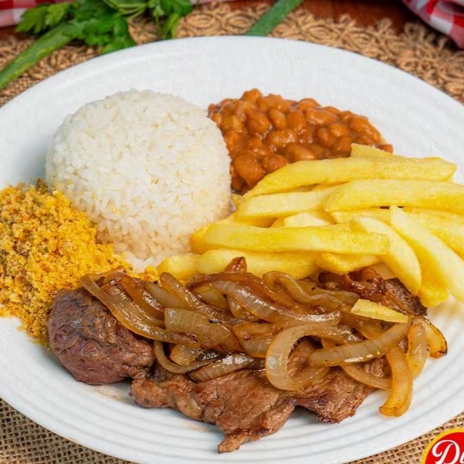Bife Acebolado macio e super saboroso com tempero exclusivo, o melhor sem dúvida ! Neste prato você leva uma marmita de arroz , feijão e dois acompanhamentos e dois pedacos do suculento bife acebolado Na embalagem.