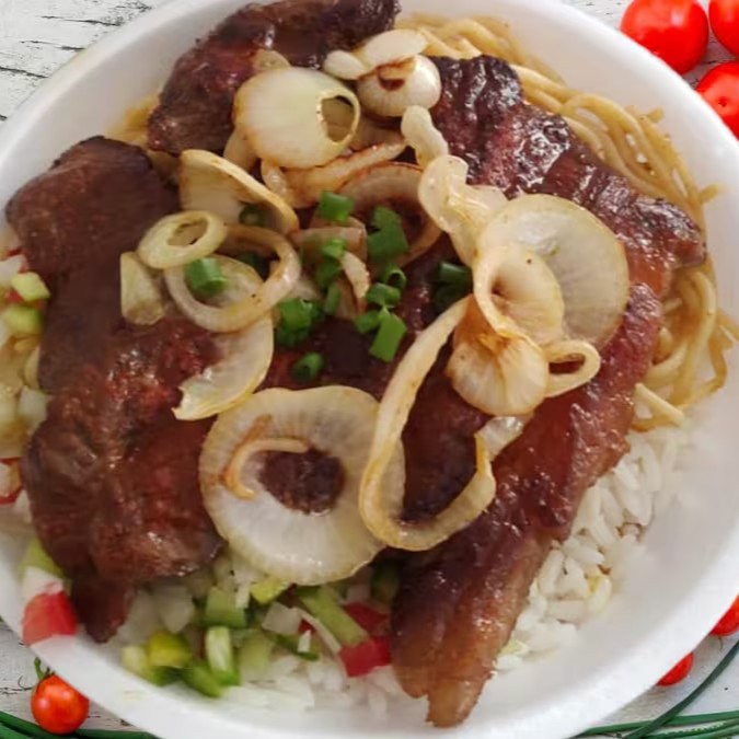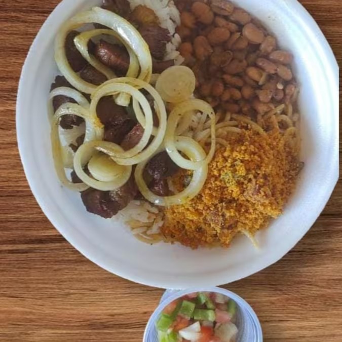 Um dlicioso Bife frito e acebolado no capricho. Vai Feijão, arroz,Macarrão, Farofa e Vinagrete Marmita 600g aprox )