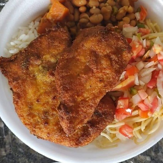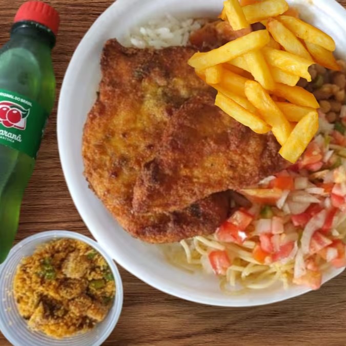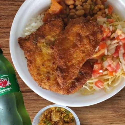 Um delicioso Filezinho de Frango a Milanesa com Batata Frita e um Refri bem gelado. Vai feijão mulato, arroz, macarrão, vinagrete e farofa. ( Marmita 500g aprox )