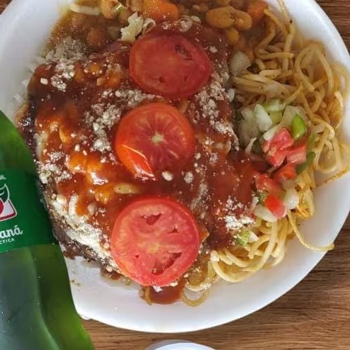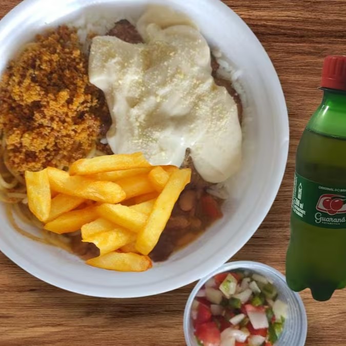 Um delicioso Filezinho frito e coberto com um delicioso molho de Queijo por cima mais Batata Frita e um Refri 200ml bem gelado. Vai feijão mulato, arroz, macarrão, vinagrete, farofa. (Marmita 500g aprox )