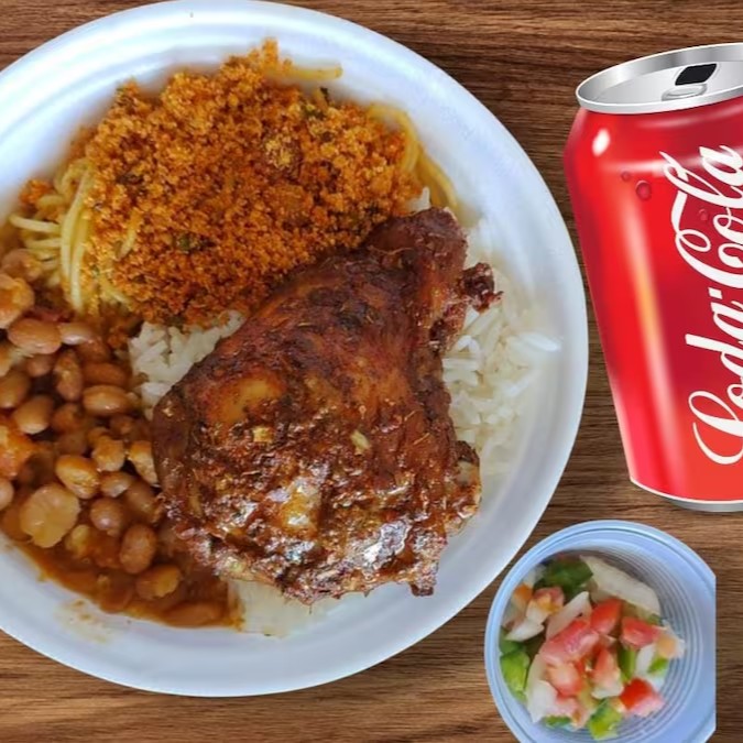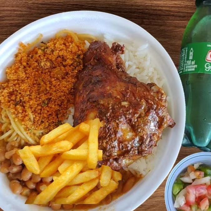 Uma deliciosa Sobrecoxa ao Forno tempero selecionados com Batata frita e um Refri 200ml bem gelada. Vai Arroz, Feijão mulado,