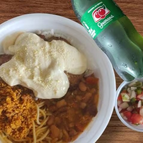 Vai feijão mulado, arroz, macarrão, vinagrete, farofa.