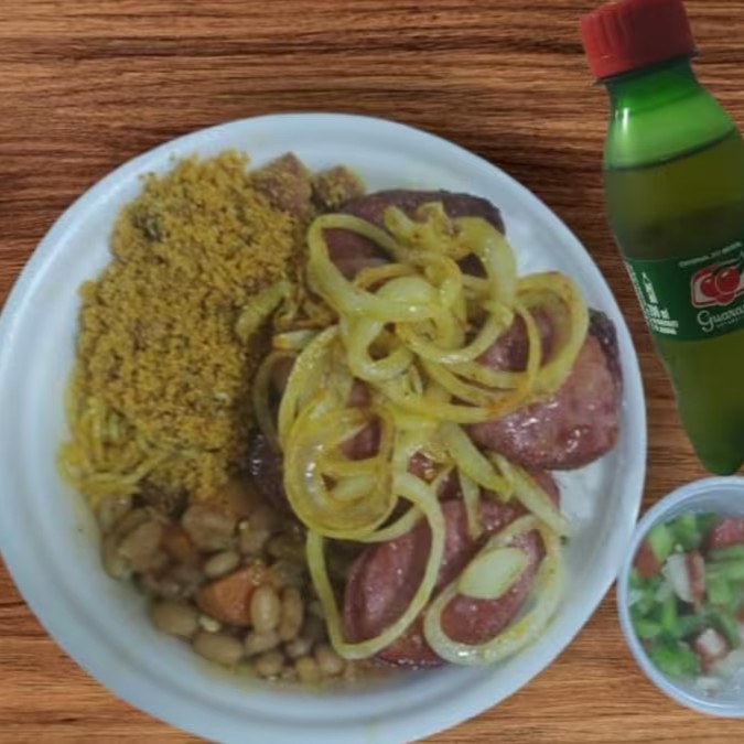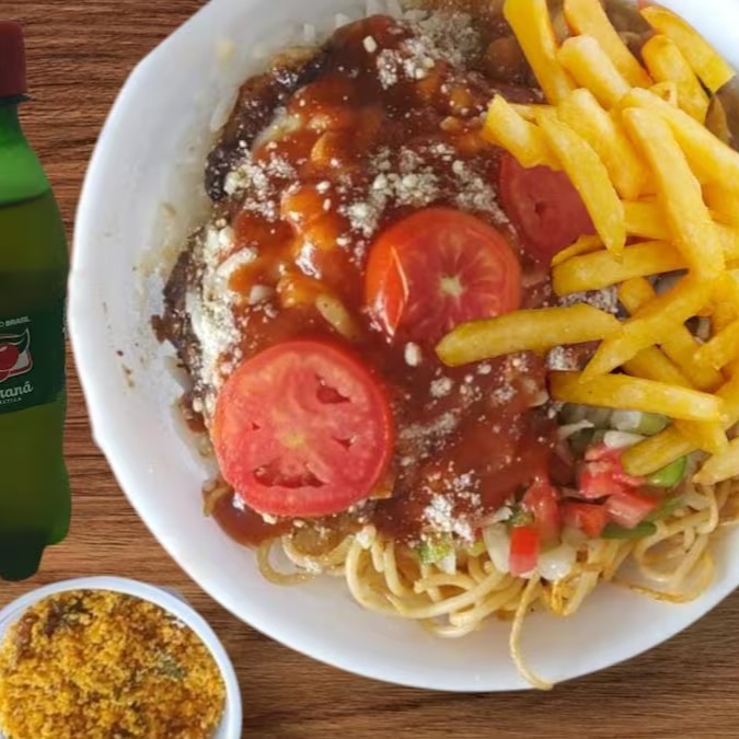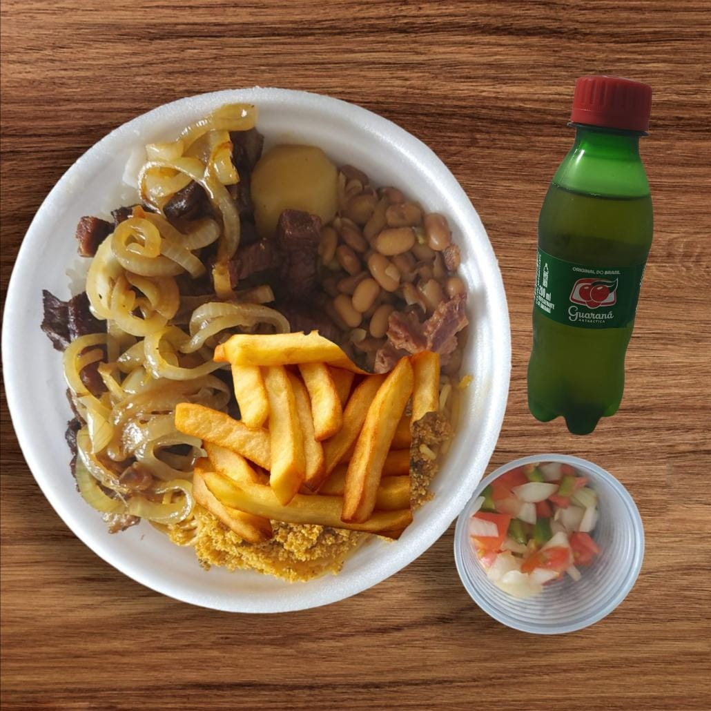 Charque Acebolado com Batata Frita e um refri 200ml bem gelado. Vai Arroz, Feijão, Macarrão, Farofa e Vinagrete.
