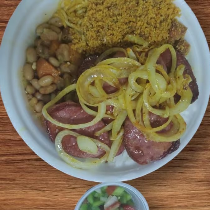 Uma deliciosa Calabresa frita Acebolado na medida vai feijão, arroz, macarrão, farofa, vinagrete