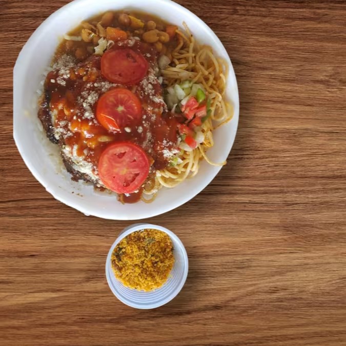 Vai feijão mulatinho, arroz, macarrão, farofa, vinagrete.