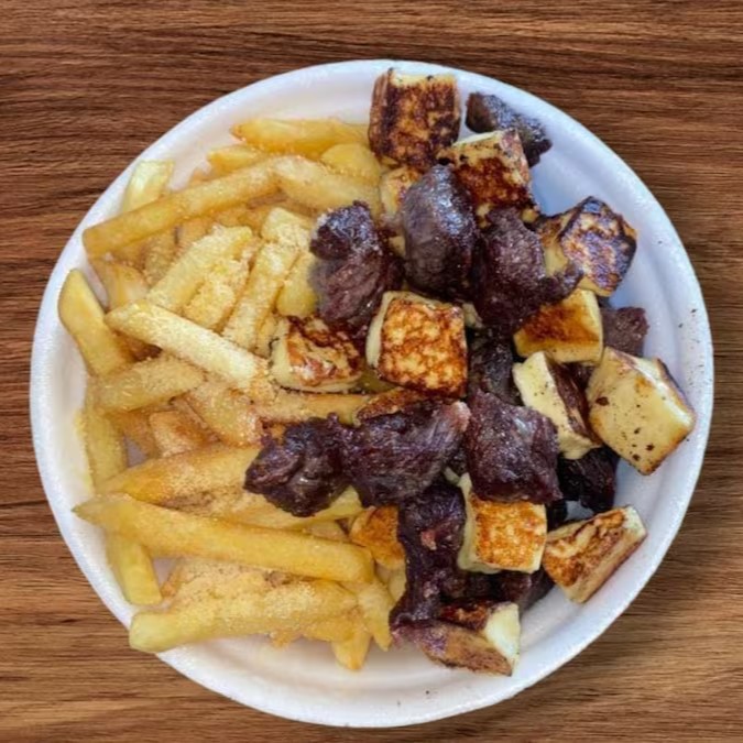 Uma delicioso Carne de Sol com uma delicioso Batata frita e Queijo frito por cima+Refri 200ml gratís