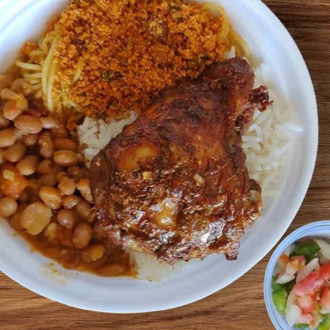 Uma deliciosa Sobrecoxa de Frango Ao Forno . Feijão mulato, Arroz, Macarrão, Farofa e Vinagrete Aprox 500g