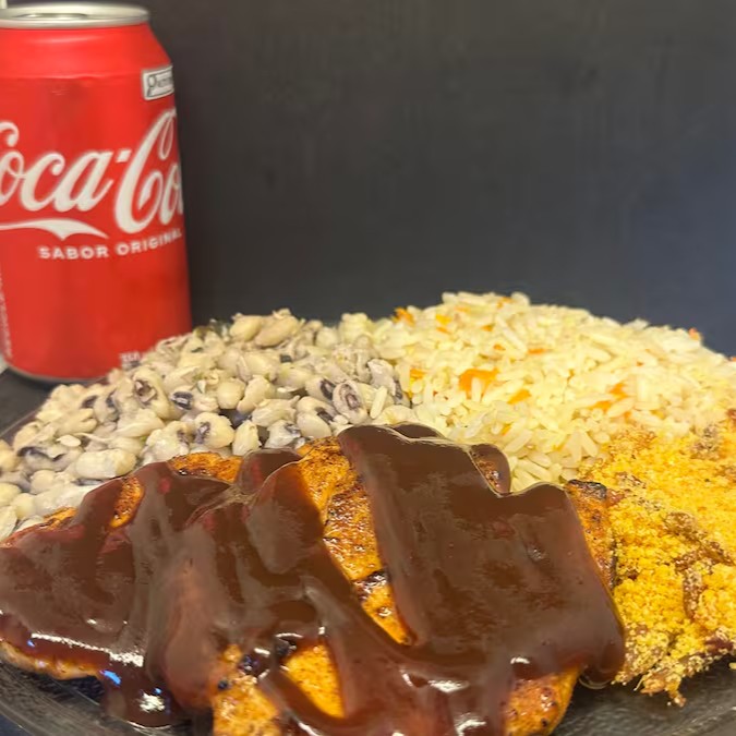 Filé de frango grelhado na parrilla com molho barbecue artesanal. Acompanha feijão macassar , arroz branco e farofa especial de cebola + Coca lata 350ml