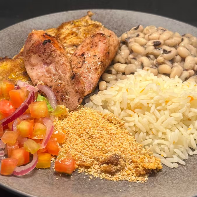 Acompanha feijão macassar, arroz, farofa e vinagrete.