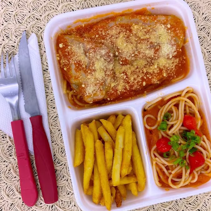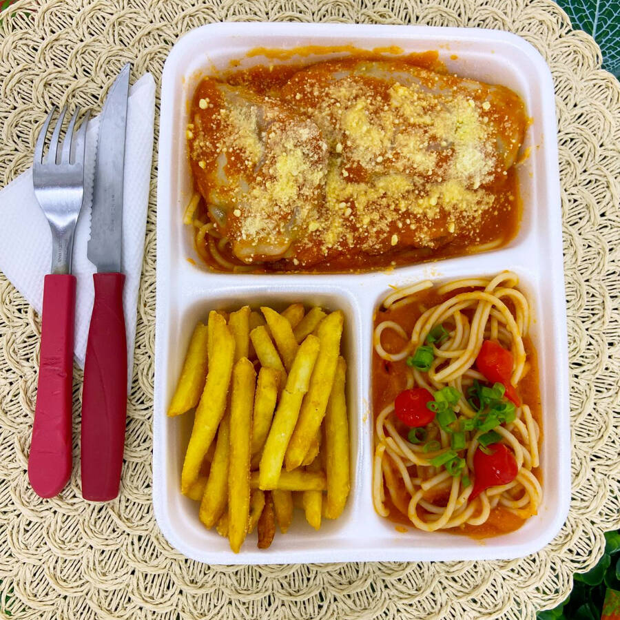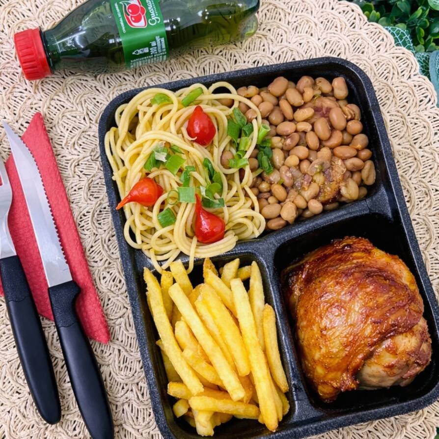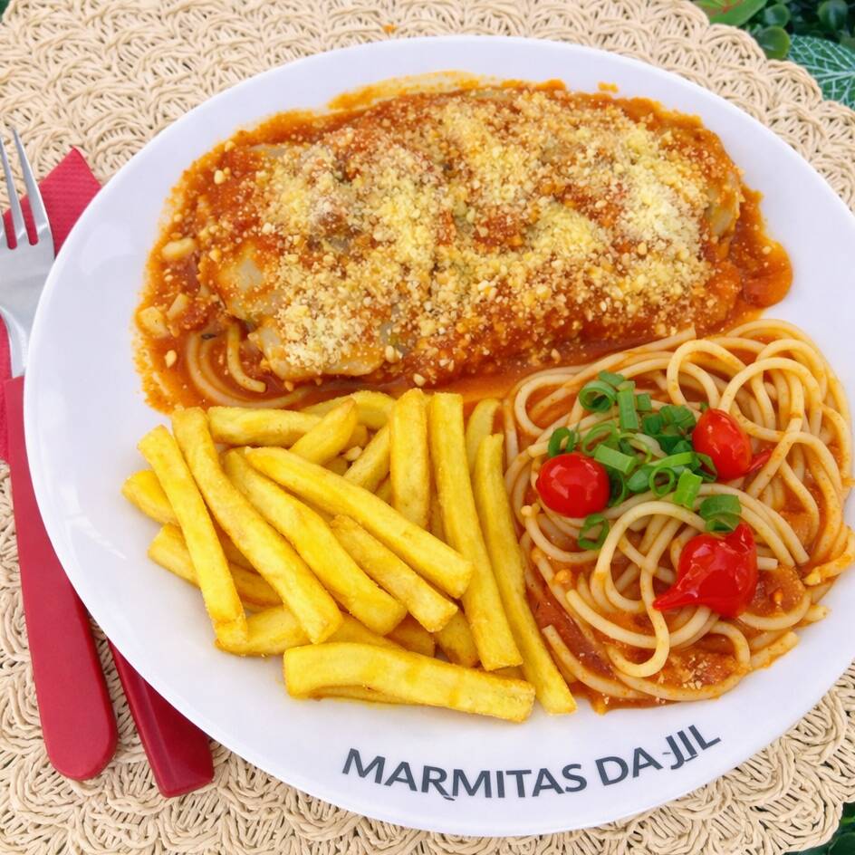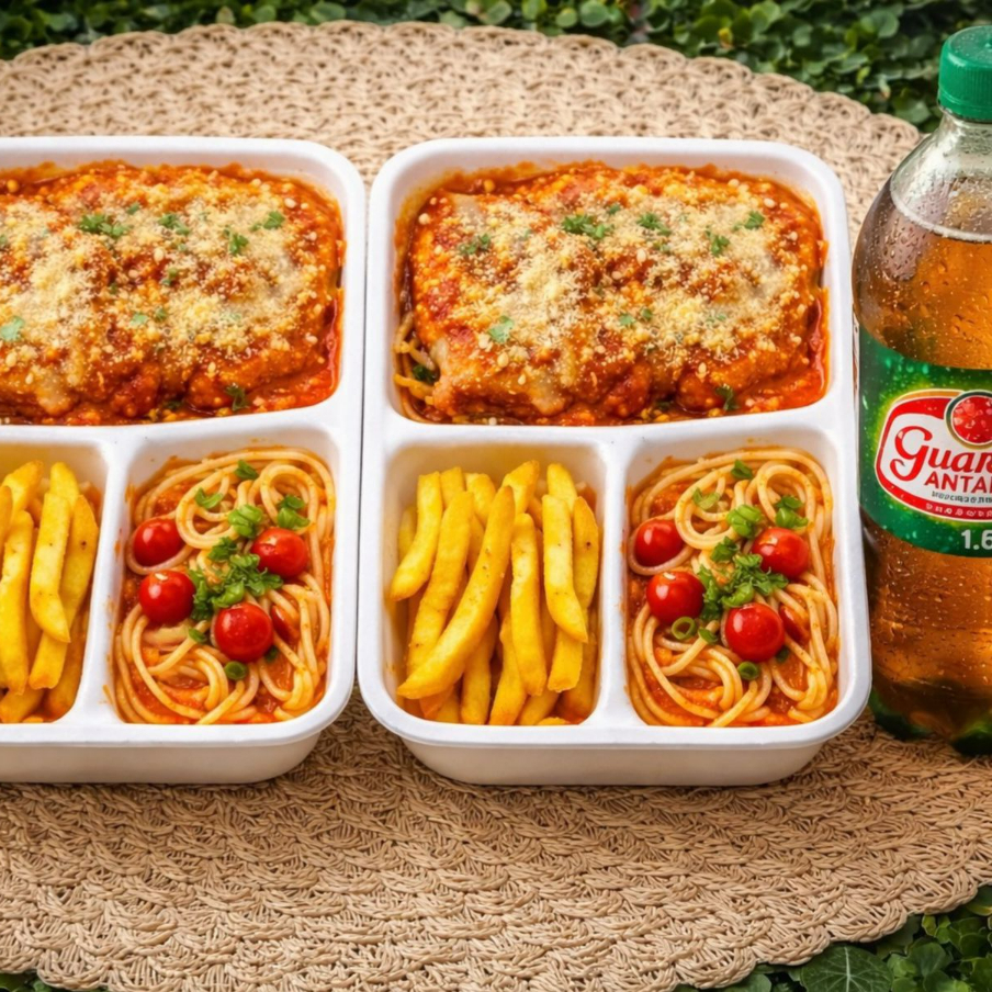Delicioso combo duplo preparado para quem gosta de comer bem! São 2 marmitas completas, cada uma com: Parmegiana suculenta, coberta com molho de tomate encorpado e finalizada com queijo bem derretido e parmesão ralado Batata frita dourada e crocante, no ponto certo Espaguete ao molho vermelho, com tomates cereja e toque de ervas frescas Para completar, acompanha 1 Guaraná Antarctica de 1 litro, bem gelado, perfeito para harmonizar com o prato.