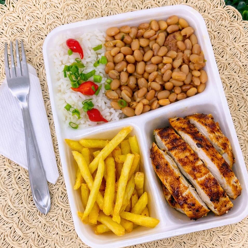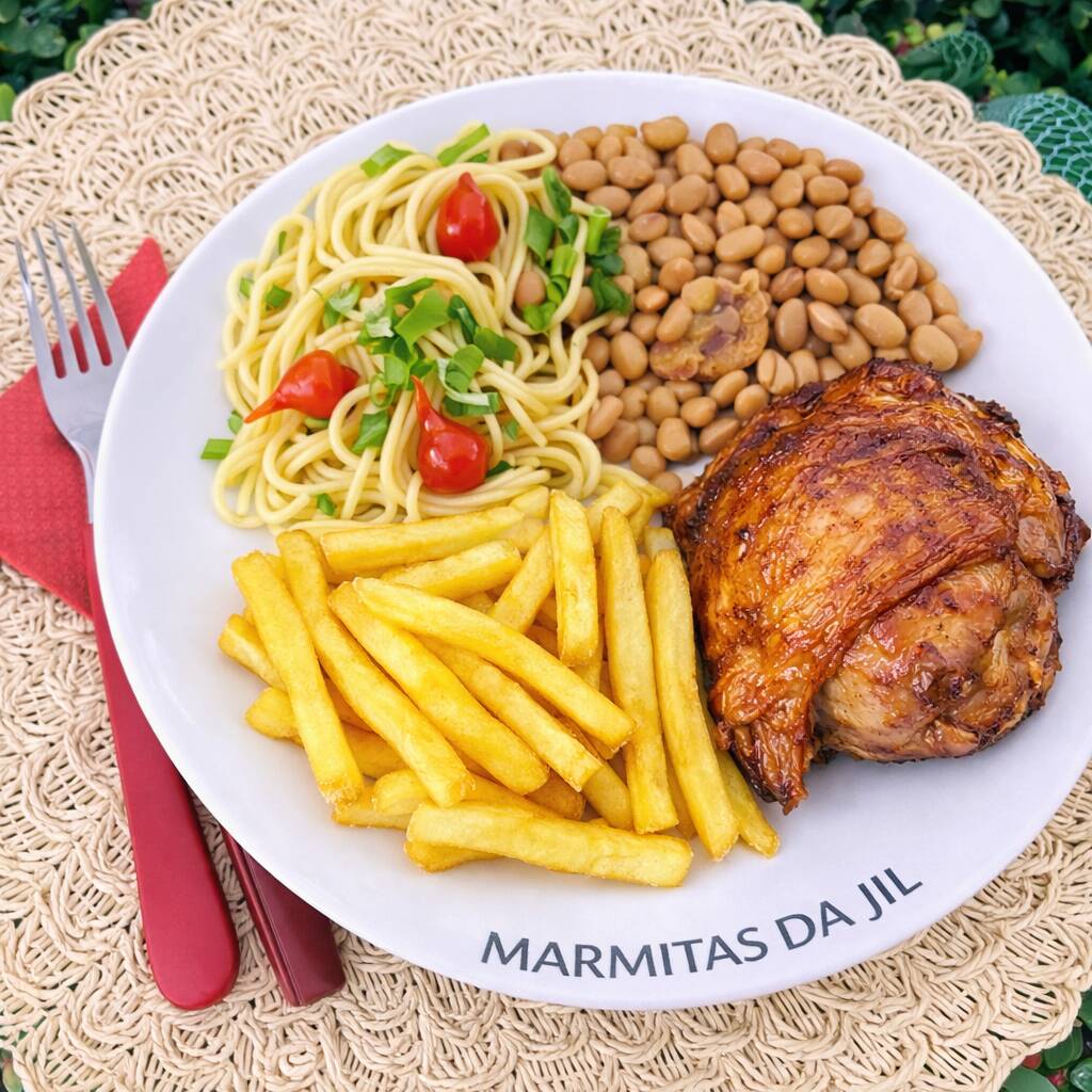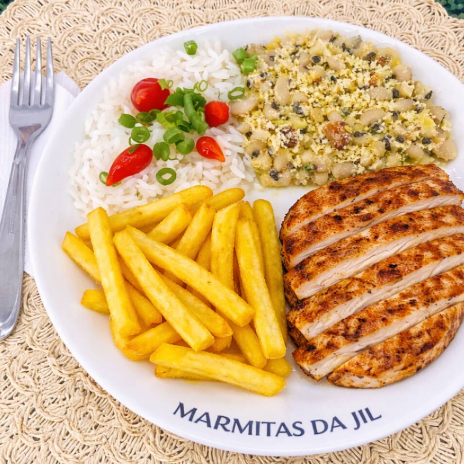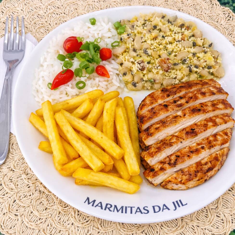 Marmita completa com arroz branco soltinho, feijão temperado com farofa crocante, frango grelhado suculento e bem dourado, acompanhado de batata frita crocante. Acompanha 1 Guaraná Antarctica caçulinha 200 ml bem gelado. Uma refeição equilibrada, saborosa e perfeita para o dia a dia.