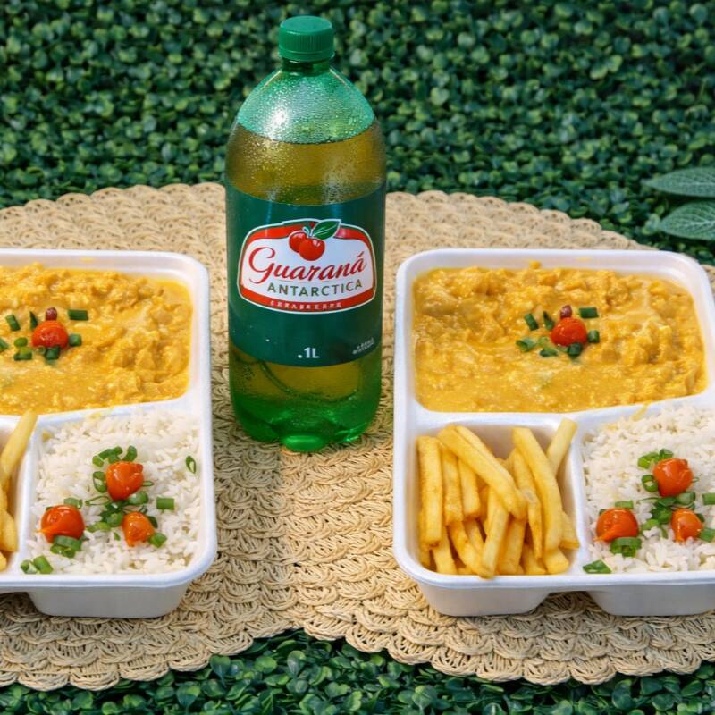 Dois deliciosos estrogonofes de frango, bem cremosos e cheios de sabor, acompanhados de arroz branquinho soltinho e batata frita dourada e crocante. Para completar, 1 Guaraná Antarctica de 1 litro, bem gelado, perfeito para acompanhar a refeição.