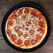 A compra inclui 2 pizzas grandes, disponíveis nos sabores mussarela, calabresa, presunto ou mista (metade mussarela, com 25% de calabresa e 25% de presunto).