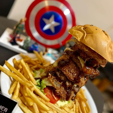 Burguer Nick Fury, acompanhado de uma batata pequena e uma lata de refrigerante. Uma combinação deliciosa para satisfazer seu apetite.