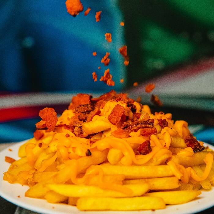 Batata frita coberta com creme de cheddar artesanal, acompanhada de bacon crocante.