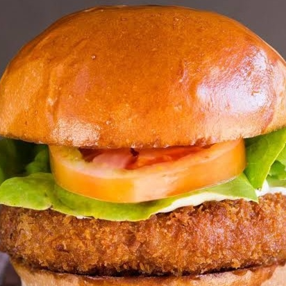 Pão brioche Filé de frango empanado Alface Tomate Cebola roxa Queijo cheddar Molho de ervas finas.