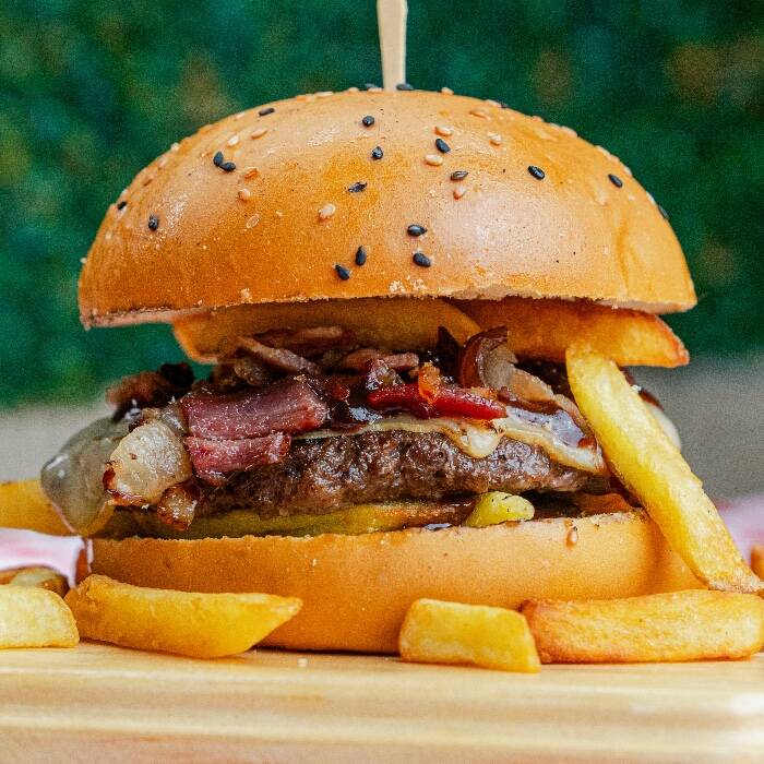 Pão brioche recheado com um blend de carnes de 120g, provolone maçaricado, bacon e molho barbecue, acompanhado de batatas dentro do pão. Sabor irresistível para momentos especiais.