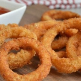 Porção com onion rings e batata frita, servida com molho especial.