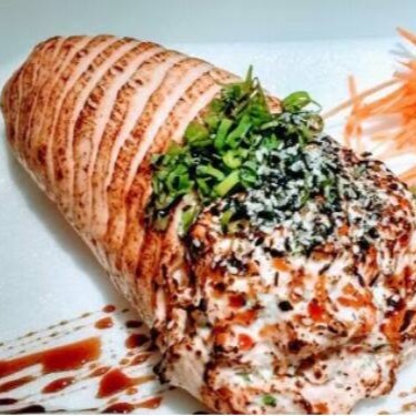 Lâmina de salmão, recheada com arroz, gergelim, camarão natural Apenas Por Cima (para não maçaricado e camarão empanado frito para maçaricado), Pasta de salmão, kani, cebolinho, alho torrado e cream cheese.