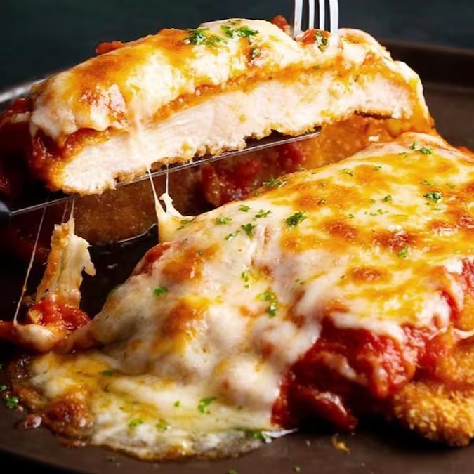 Filé de frango com queijo mussarela, molho especial de tomate e macarrão talharim.
