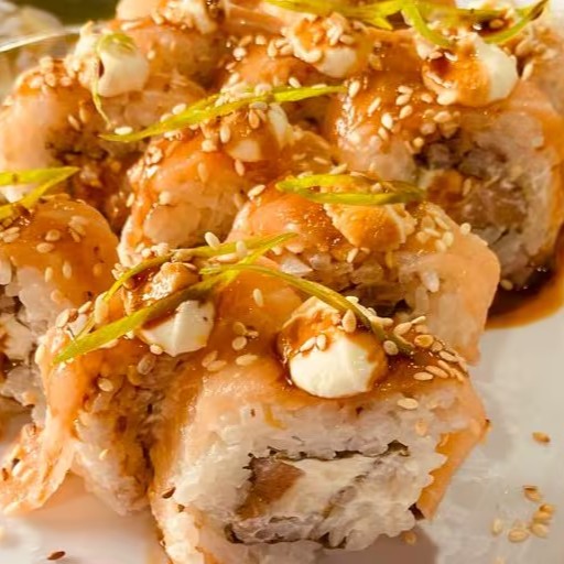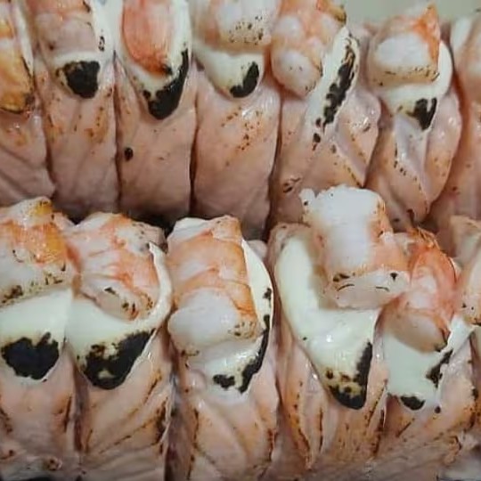 Uramaki com lâmina de salmão por cima e finalizado com cream cheese e camarão natural em seu topo. 10 unidades