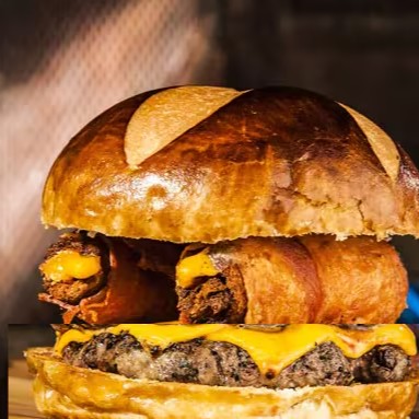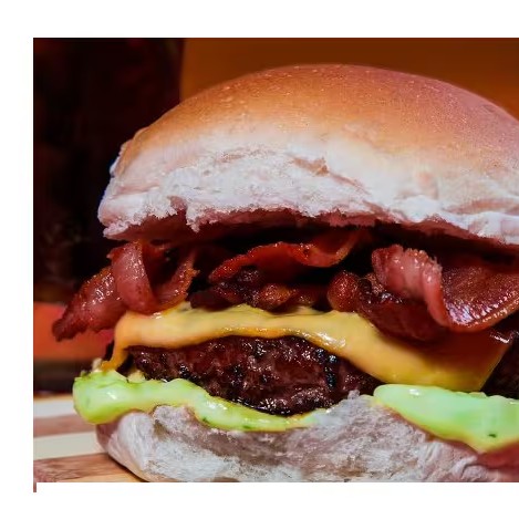 Pão smash com carne caseira, tomate, alface, pão, queijo mozzarella, molho especial , Bacon em tiras.