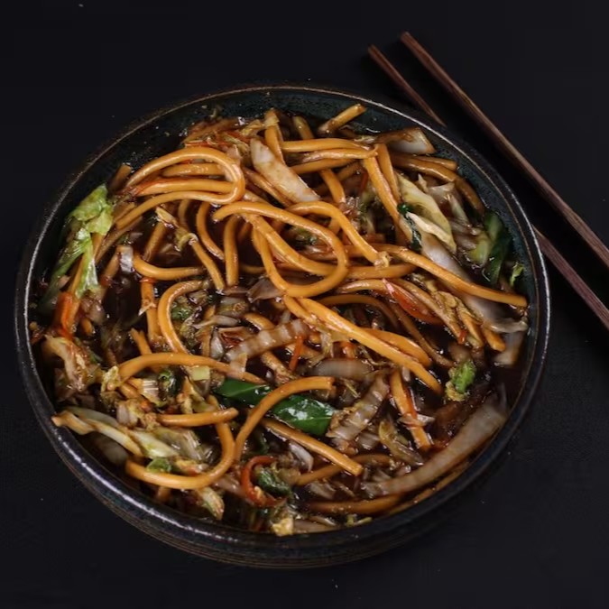 Delicioso yakisoba com frango, molho gostoso, cebola, acelga, cenoura, repolho e macarrão.