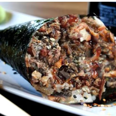 13 Peças de Tsumaki. Este consiste em salmão, cream cheese e arroz envoltos em uma camada de queijo muçarela maçaricado.