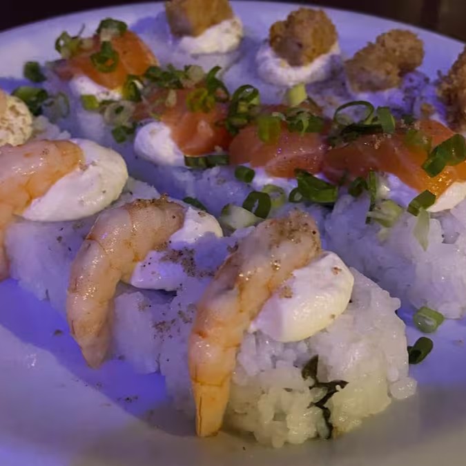 Arroz, gergelim, cream cheese, camarão, salmão em cubos com cebolinha.