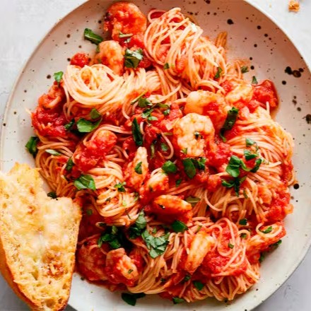 Camarão com macarrão talharim ao molho de tomate com queijo parmesão ralado e ervilha.