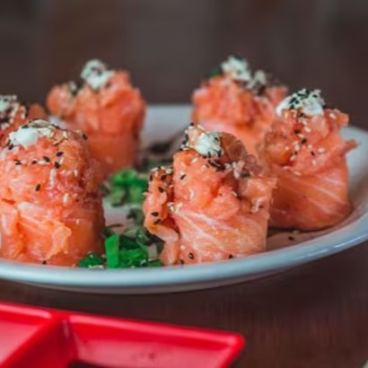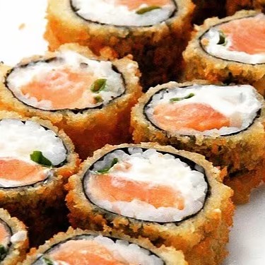 12 unidades de sushi com massa de harumaki, arroz, cream cheese, salmão, cebolinha.