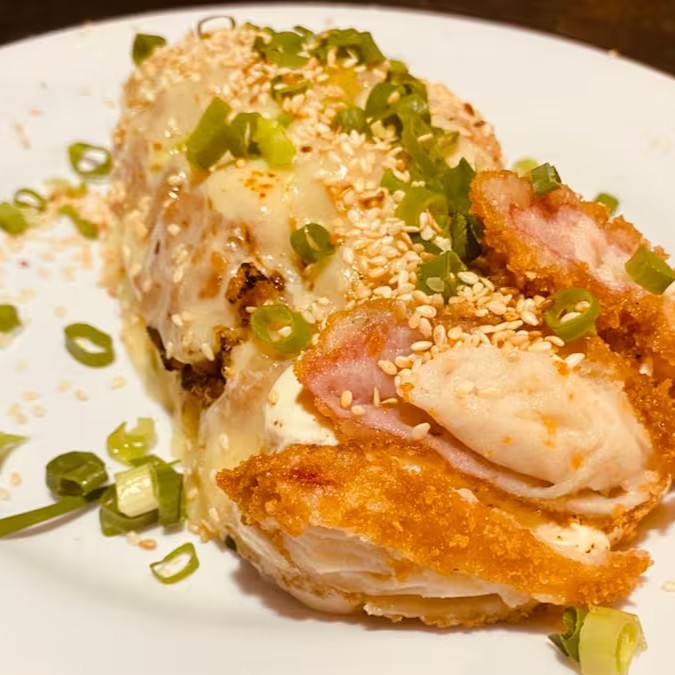 Arroz recheado com camarão, kani empanado e cream cheese, envolto em uma lâmina de salmão e queijo muçarela.