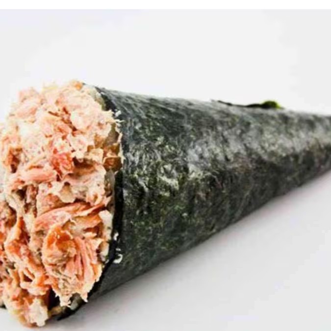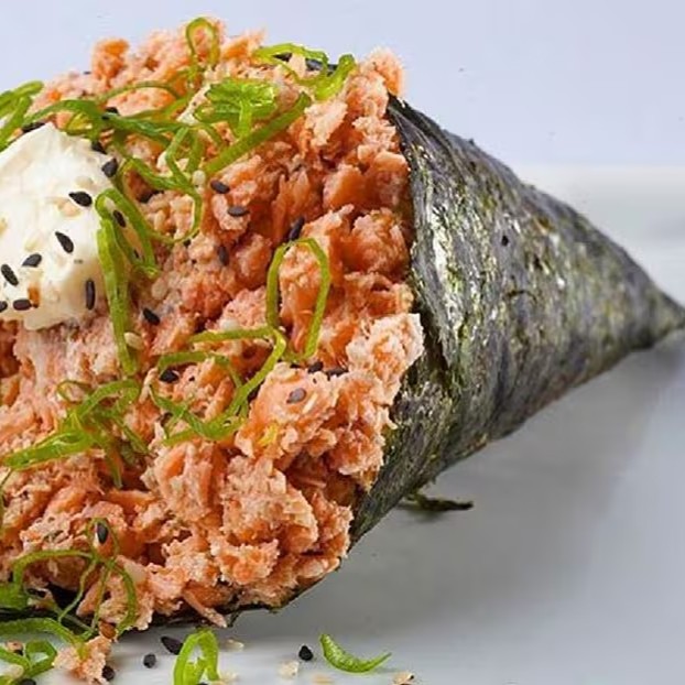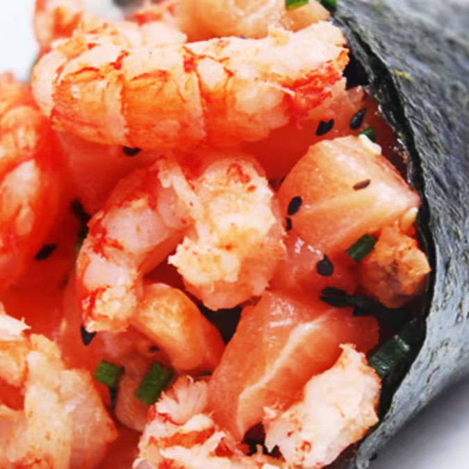 Temaki na massa de harumaki de salmão, camarao e kani.