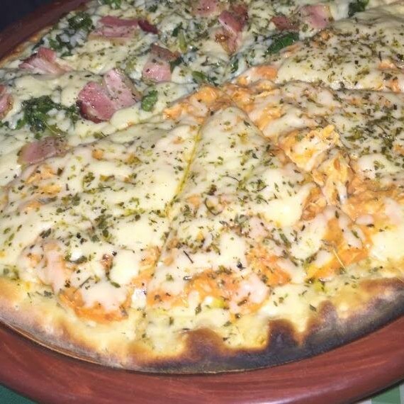 Metade mucarela, metade calabresa metade presunto e metade frango