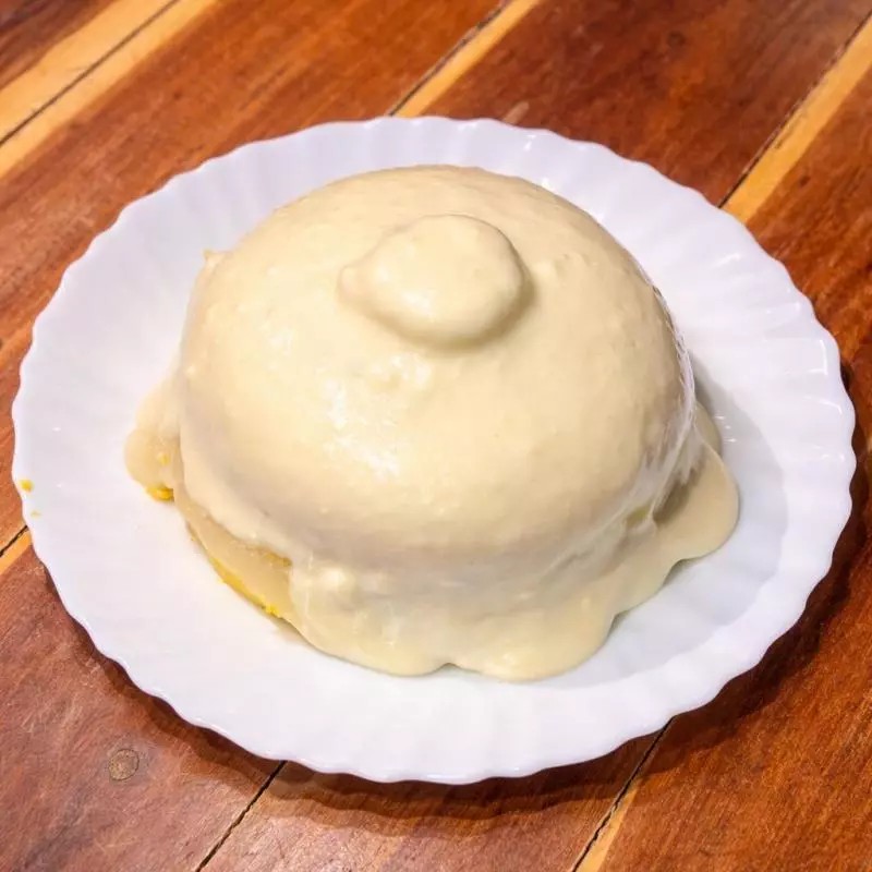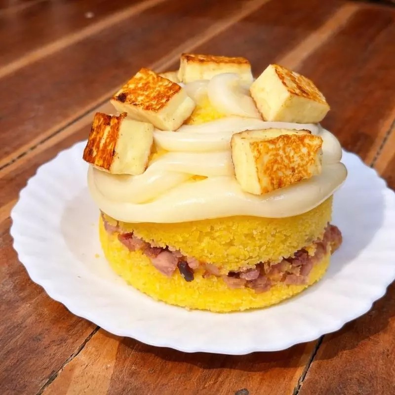 Cuscuz peito de moça, coberto com bolo de rolo, creme de goiabada e queijo do reino ralado.