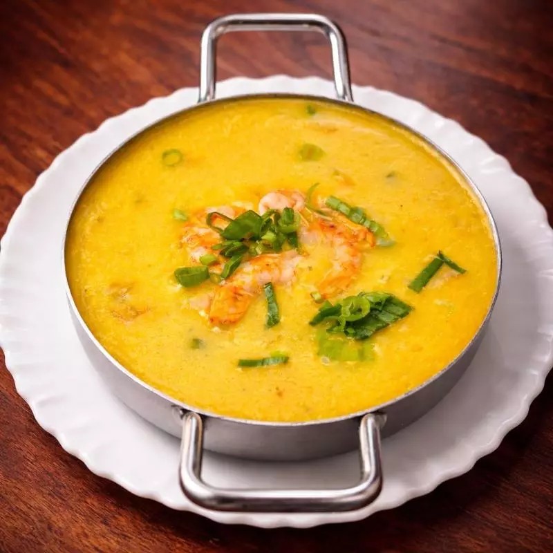 Creme de macaxeira guarnecido com leite de coco, filé de camarão, vinagrete puxado no azeite de dendê.