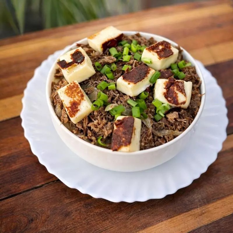 Creme de macaxeira guarnecido com carne de sol e queijo coalho.