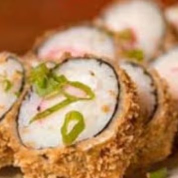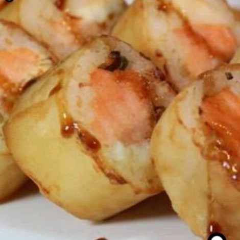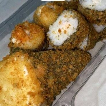 Arroz empanado na panko frito ,recheado com camarao e creme cheese e alface